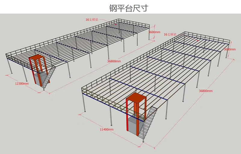鋼平臺是用單支支柱做主支撐,用主次梁做樓面支撐,將倉庫分為上下2~3個空間的一種獨特貨架。貨架平臺是在重型貨架頂部搭建一鋼平臺,集貨架與平臺一體的鋼結構。分隔出的空間可做存儲或辦公用。